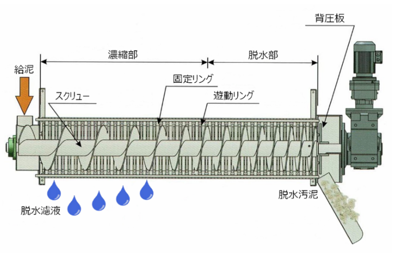 - ・遊動リングと固定リングの積層により形 成されたシリンダーと、シリンダーを貫くス クリューで脱水主要部を構成